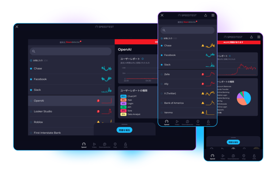 障害や接続トラブルの追跡を目的とした世界で最も人気のプラットフォーム「Downdetector」を使って、お気に入りのサービスで発生している問題をリアルタイムで監視・報告しましょう。